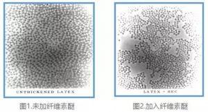 對于羥乙基纖維素增稠的體系,涂料在成膜后,由于乳膠粒子的不均勻性,將有孔道形成,而且選用的羥乙基纖維素增稠效率越高,這種(看不到的)缺陷越嚴(yán)重,而這種缺陷會造成漆膜光澤下降,并在漆膜中形成微孔道,防水、防腐蝕性能將受到影響。
